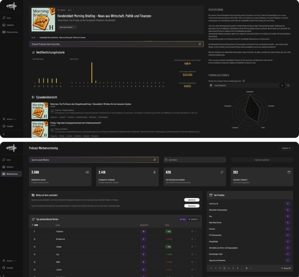 Täglich neu erschienene Podcast-Episoden werden kontinuierlich erfasst und nach Suchbegriffen analysiert. Die Latenz zwischen Veröffentlichung einer Episode und verfügbaren Insights liegt typischerweise in unter einer Stunde.