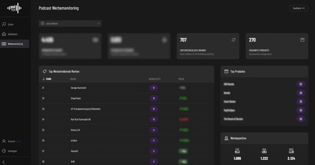 Beschreibung: PODMON zeigt, welche Marken in Podcasts aktiv sind, welche Formate sie nutzen und wie ihre Präsenz sich verändert.