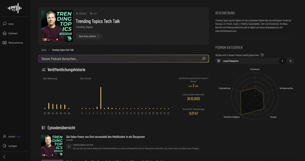 Die Podcastdetailseite zeigt dir spannende Insights: Veröffentlichungshistorie (nach Uhrzeit und Wochentag), Epsiodenübersicht, Kategorien, KI-Zusammenfassungen)