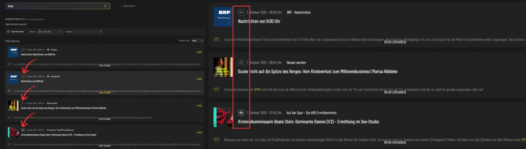 Beschreibung: Automatisch identifizierte Podcast-Episoden mit besonders relevanten Themen, Gästen oder Marken-Erwähnungen.
