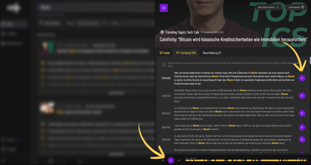 Klick dich in die Episoden rein und durchsuche das Transkript mit allen Highlight Stellen deines Suchbegriffs. Springe auf Wunsche in die Audio Spur an die genaue Stelle und höre es nach.